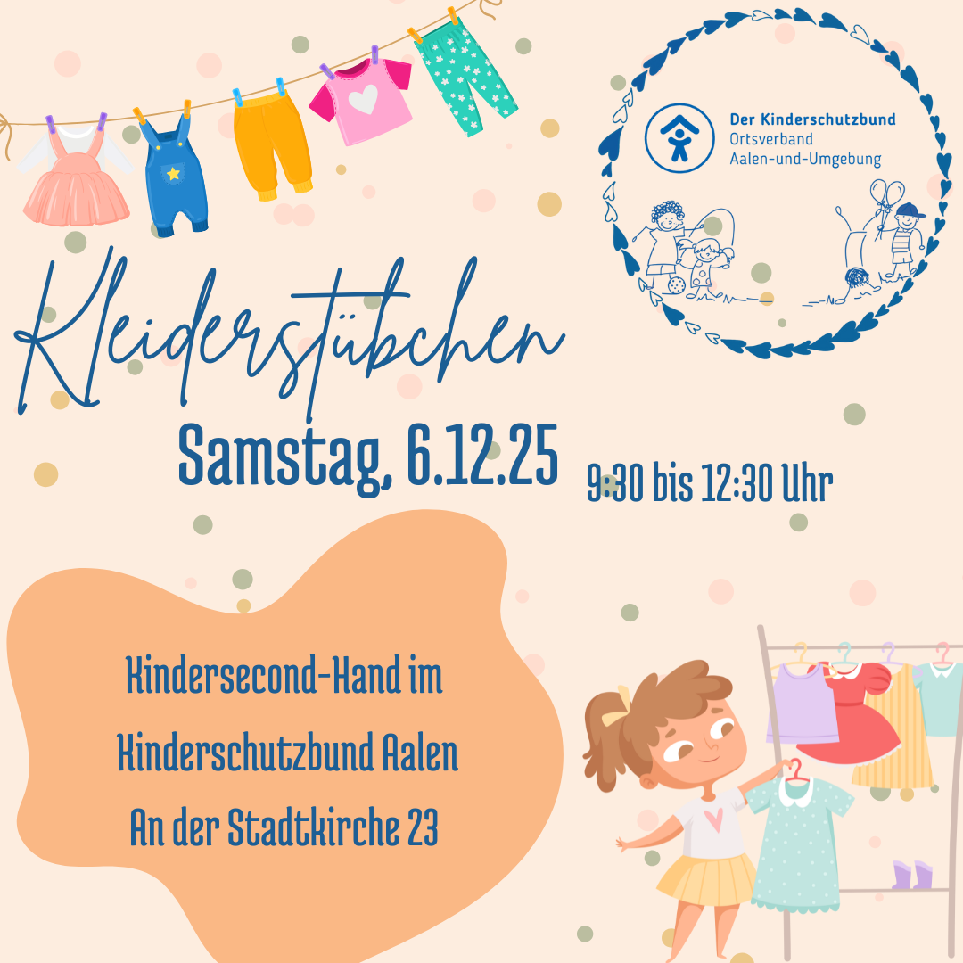 Das Kleiderstübchen ist jetzt Montag von 15 bis 17 Uhr geöffnet. Wer also Dienstag und MIttwochvormittag nicht in der Stadt ist, kann jetzt jeden Montag Nachmittag, außer in den Ferien vorbeikommen und nach gut erhalten, gebrauchten Kinderkleidern, Spielzeug und Kinderbüchern stöbern. Elli und Karin freuen sich auf Euren Besuch! Das Kleiderstübchen findet ihr mitten in der Stadt Aalen An der Stadtkirche 23 – der Eingang ist über den Hof erreichbar.